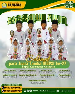 Alhamdulillah siswa dan siswi SDIT Ar-Risalah Kartasura berhasil meraih prestasi pada Lomba MAPSI SD ke-27 di tingkat Kecamatan yang dilaksanakan pada hari Sabtu, 6 September 2025 di UPTD Pendidikan dan Kebudayaan Kecamatan Kartasura.