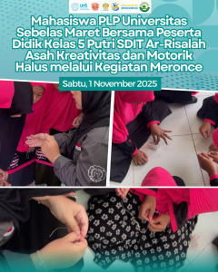 Mahasiswa PLP PGSD FKIP UNIVERSITAS SEBELAS MARET bersama peserta didik kelas 5 Putri SDIT Ar-Risalah sukses menyelenggarakan kegiatan meronce sebagai upaya mengasah kreativitas dan motorik halus peserta didik, sekaligus mendukung tercapainya tujuan Sustainable Development Goals (SDGs) nomor 4, yaitu Pendidikan Berkualitas. Melalui kegiatan ini, mahasiswa PLP berperan aktif sebagai fasilitator yang membimbing peserta didik dalam menyusun manik-manik menjadi karya yang estetis, melatih ketelitian, serta menumbuhkan rasa percaya diri. Pembelajaran berbasis praktik ini menjadi bentuk nyata implementasi pendidikan yang inklusif, partisipatif, dan berpusat pada peserta didik. Suasana belajar yang menyenangkan membuat peserta didik lebih bebas berekspresi dan berkreasi, sehingga kegiatan meronce tidak hanya menghasilkan karya seni, tetapi juga memberikan pengalaman belajar bermakna yang sejalan dengan prinsip Kurikulum Merdeka dan semangat peningkatan kualitas pendidikan di sekolah.